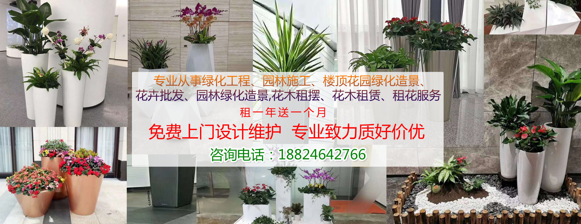 专业从事绿化工程、园林施工、楼顶花园绿化造景、花卉批发、园林绿化造景,花木租摆、花木租赁、租花服务,致力于园林绿化、园林施工;小区、工业区、私人庭院、屋顶楼顶花园绿化造景;写字楼、宾馆酒楼、节日庆典活动、会议等场所的盆花花木租摆租花服务。