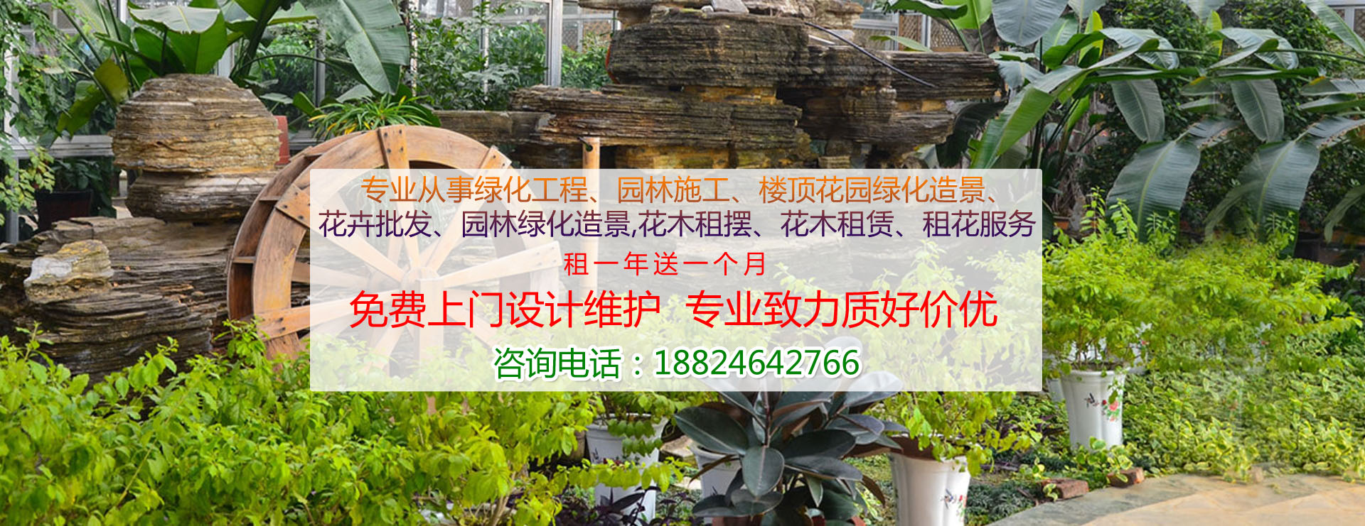专业从事绿化工程、园林施工、楼顶花园绿化造景、花卉批发、园林绿化造景,花木租摆、花木租赁、租花服务,致力于园林绿化、园林施工;小区、工业区、私人庭院、屋顶楼顶花园绿化造景;写字楼、宾馆酒楼、节日庆典活动、会议等场所的盆花花木租摆租花服务。